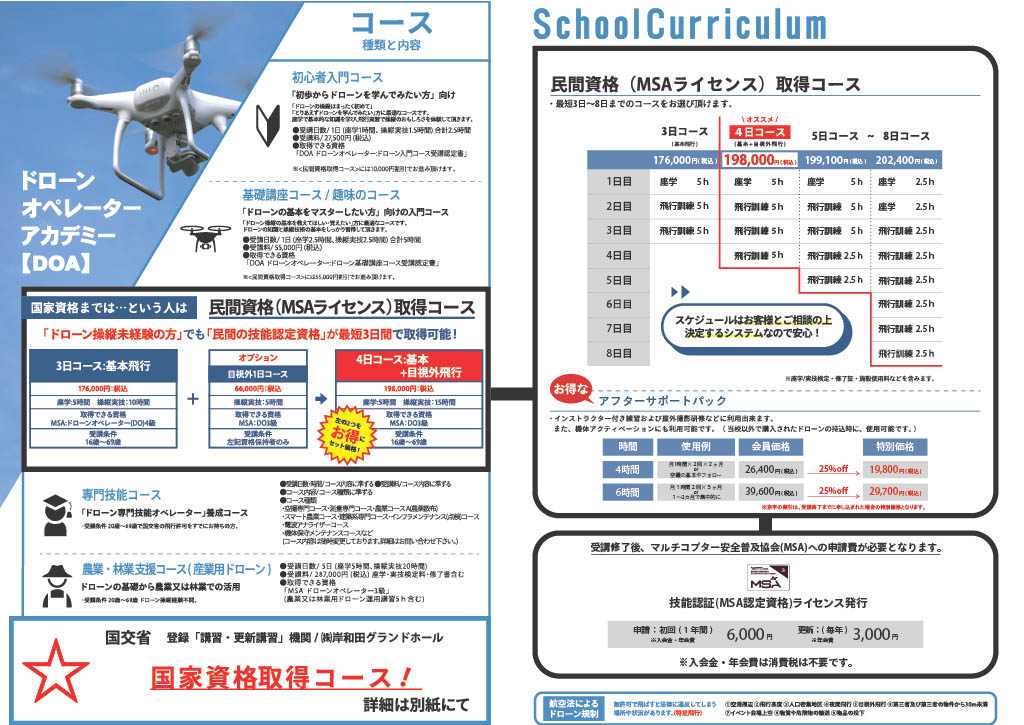 ※MSA…一般社団法人マルチコプター安全普及協会(国交省認定講習団体):3級ライセンスが取得できます。