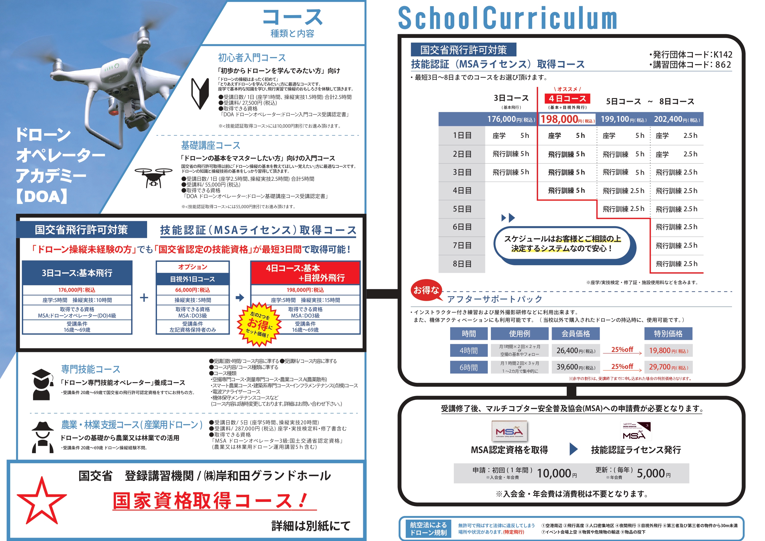 ※MSA…一般社団法人マルチコプター安全普及協会(国交省認定講習団体):3級ライセンスが取得できます。